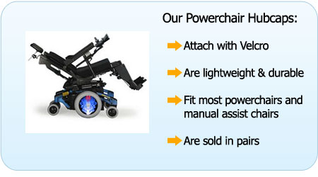 São pequenos, coloridos e projetados para encaixar sobre as rodas da cadeira.